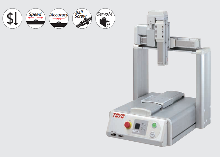 TOYO米兰·(milan)中国官方网站桌上型机械手高精度、使用方便、结合专业开发之TOYO FSE软件做点胶机功能,使点胶涂布功能更加丰富。内建CAD转路径功能,可使教导更快,搭配CCD和Laser可以进行XYZ坐标补正,可做到路径的位置连续补偿。可应用于点胶、銲锡、视觉检测、精密对位等场合。