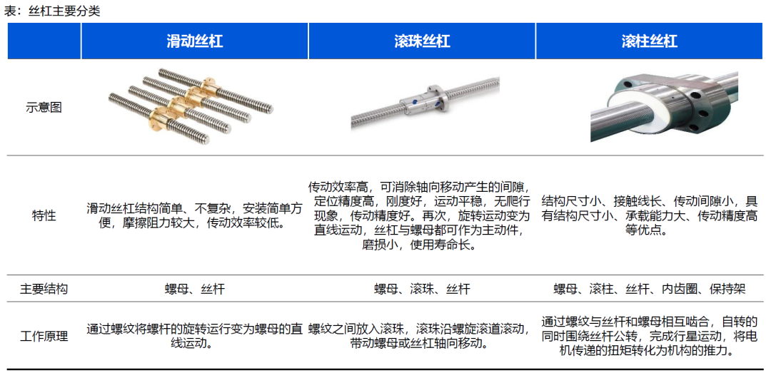 滚柱丝杠相较于滑动丝杠与滚珠丝杠,具备高承载能力、小体积、高精度等优势,是综合性能最为优异的丝杠品种。